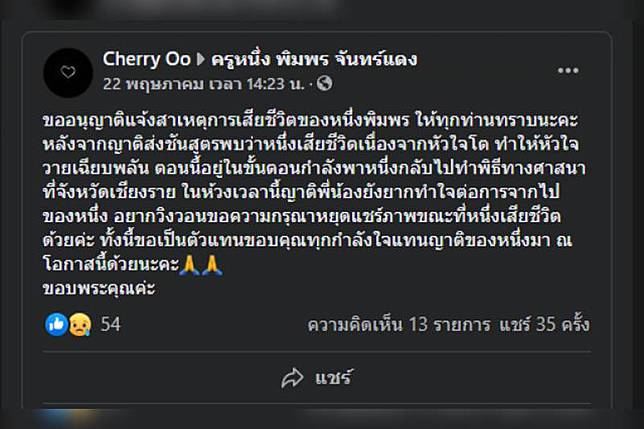 Source: image.bangkokbiznews.com ครูหนึ่ง พิมพร จันทร์แดง โพสต์ครั้งสุดท้าย ก่อนเสียชีวิตกลางไลฟ์ อัปเดตล่าสุด 26 พฤษภาคม 2564 เวลา 10:22:31 51,091 อ่าน